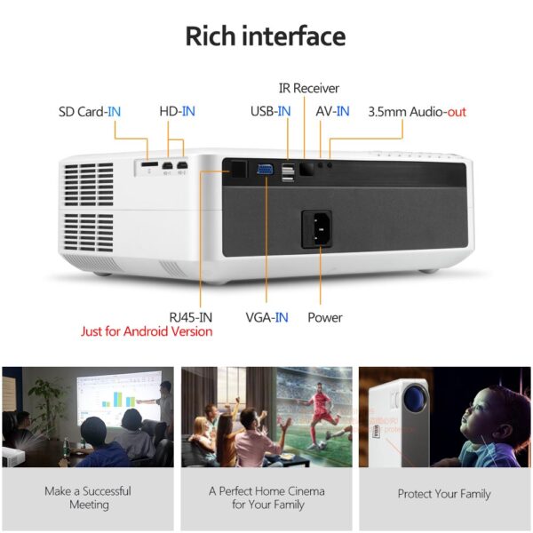 • 🔌 Versatile Inputs: HDMI, USB, VGA, AV, 3.5mm Audio